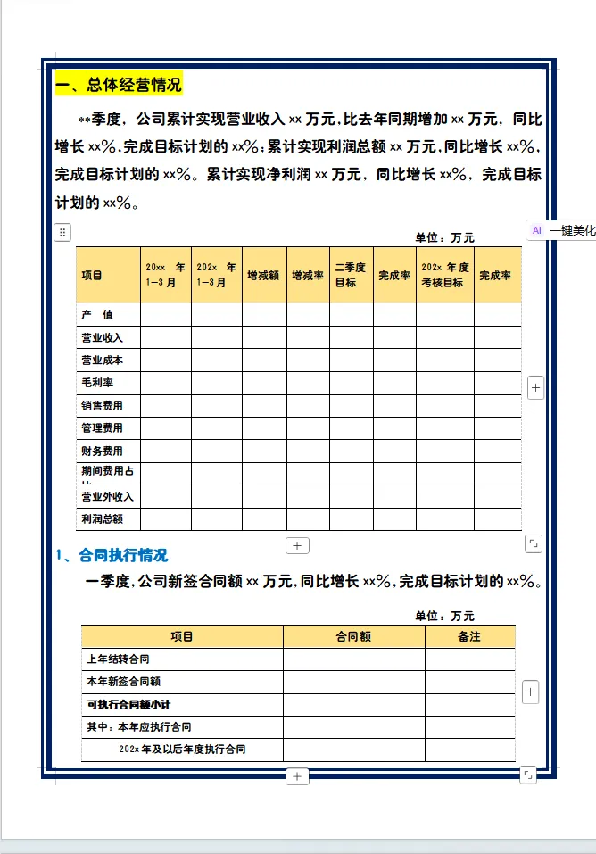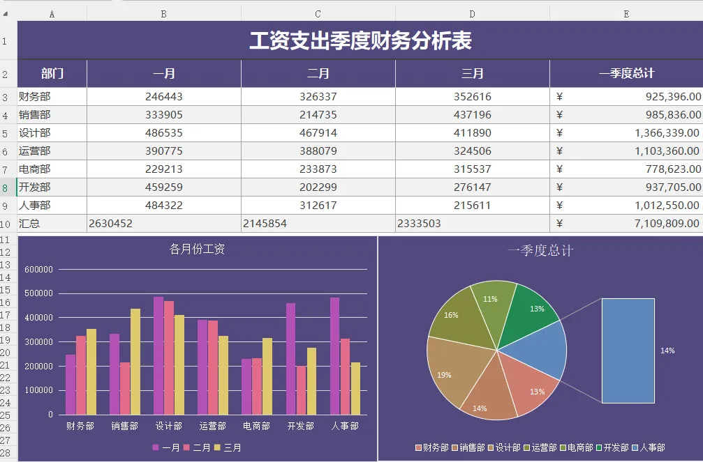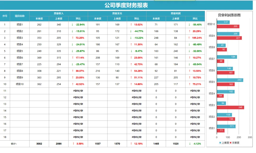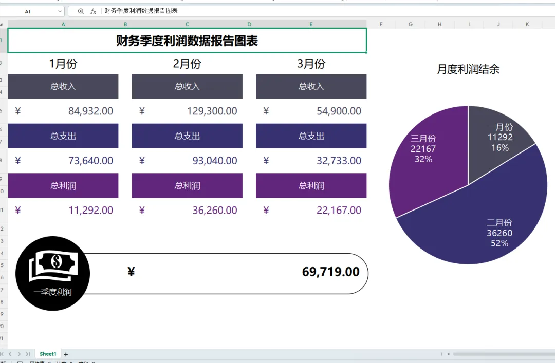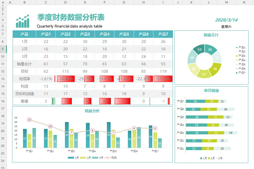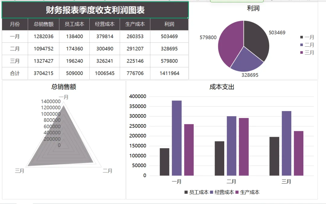 财务报表表格模板:季度财务分析表模板,带公式,一键套用自动生成可视化财务分析图形
