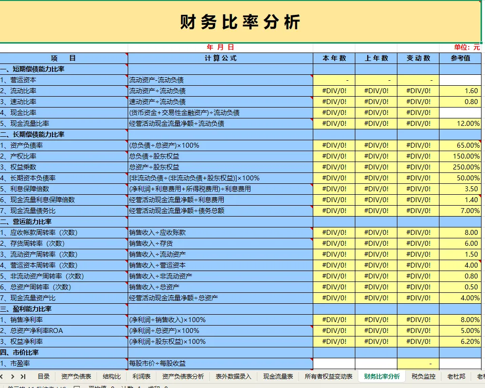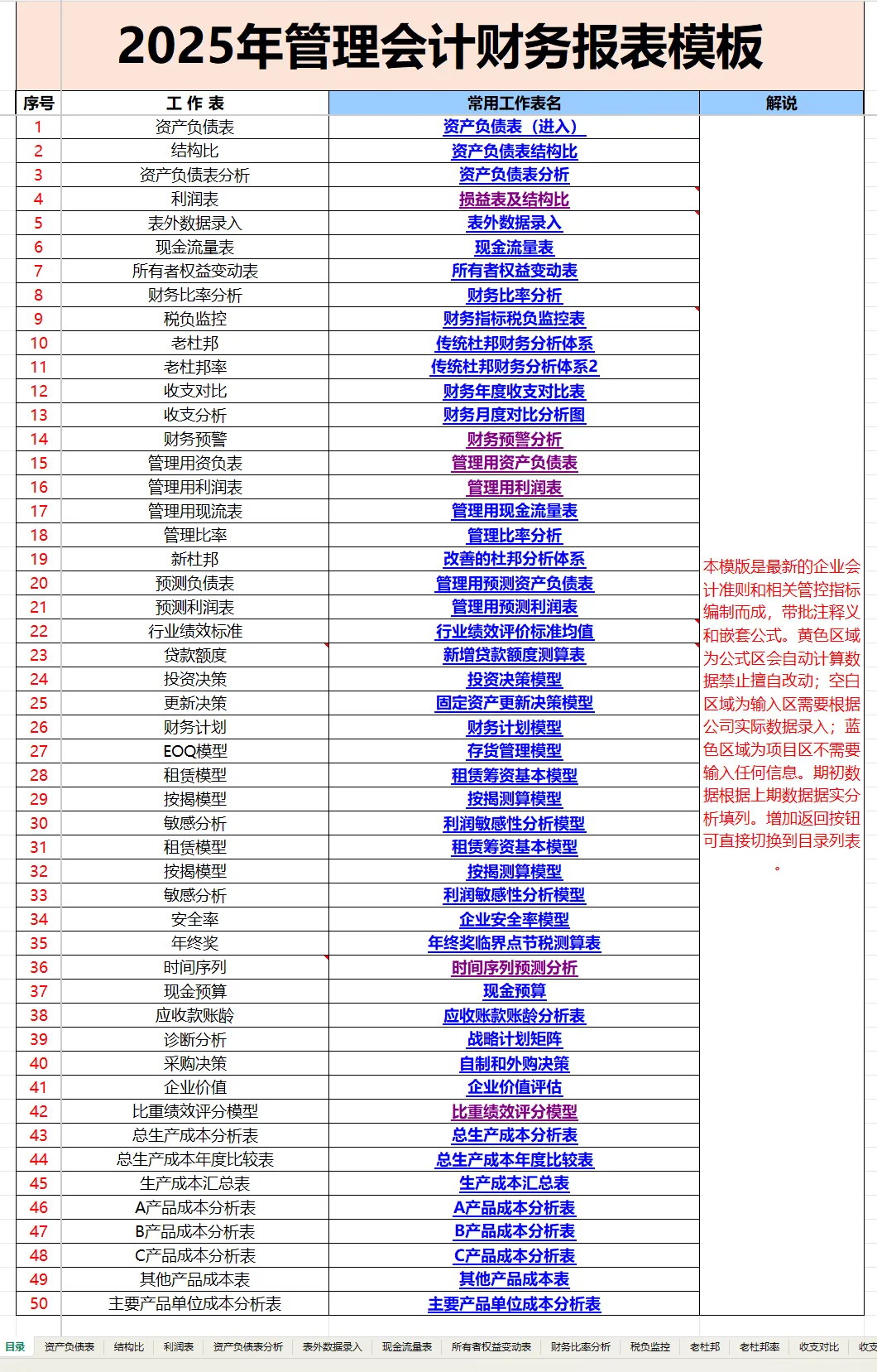 今天小鱼给大家整理一套财务表格模板,一共是50张,把财务做账和管理会计常用的报表都汇总到一个系统里面了,这样大家在做账的时候,或者是分析财务状况的时候,直接切换很方便。另外小鱼还整理财务分析常用的30个指标和50个知识点,带有财务分析公式,不用担心不会用。还有财务部做账全套工作流程图和全岗位财务管理制度,可以帮助大家更好的完成财务工作,跟着小鱼一起来看看具体的内容吧!