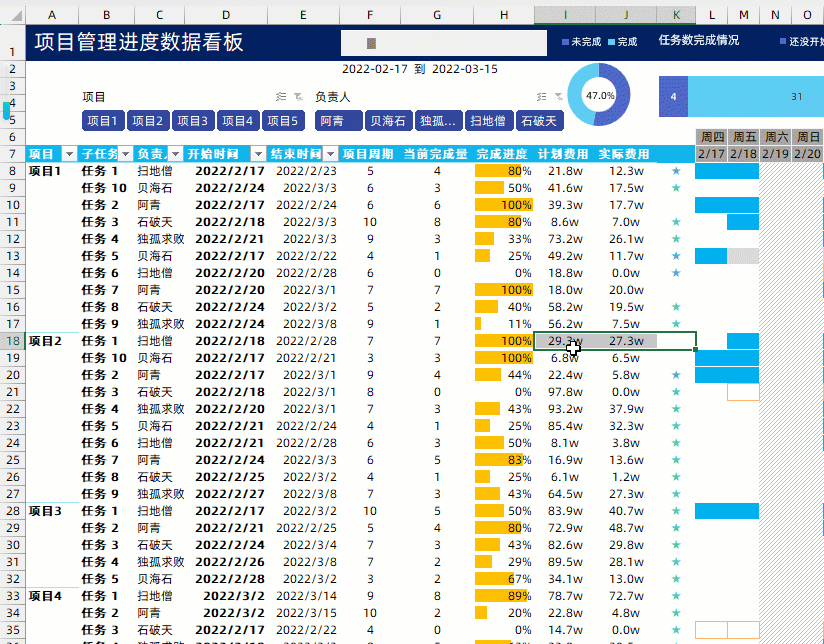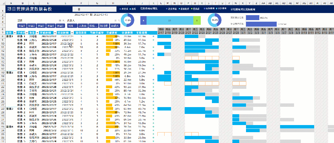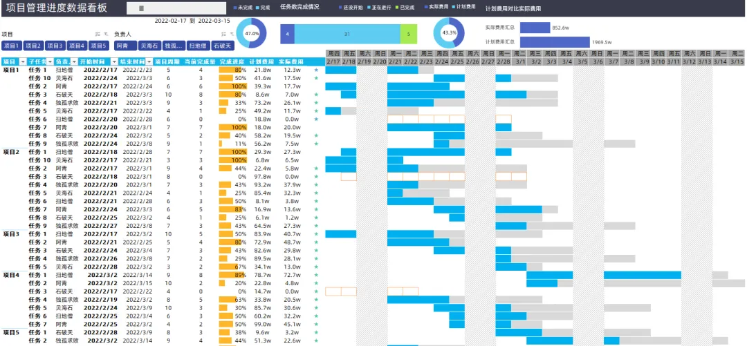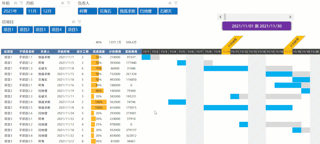 交互式甘特图,可以单独的选择某个项目进行内容的观看,当然也可以筛选年份月份,包括负责人..
