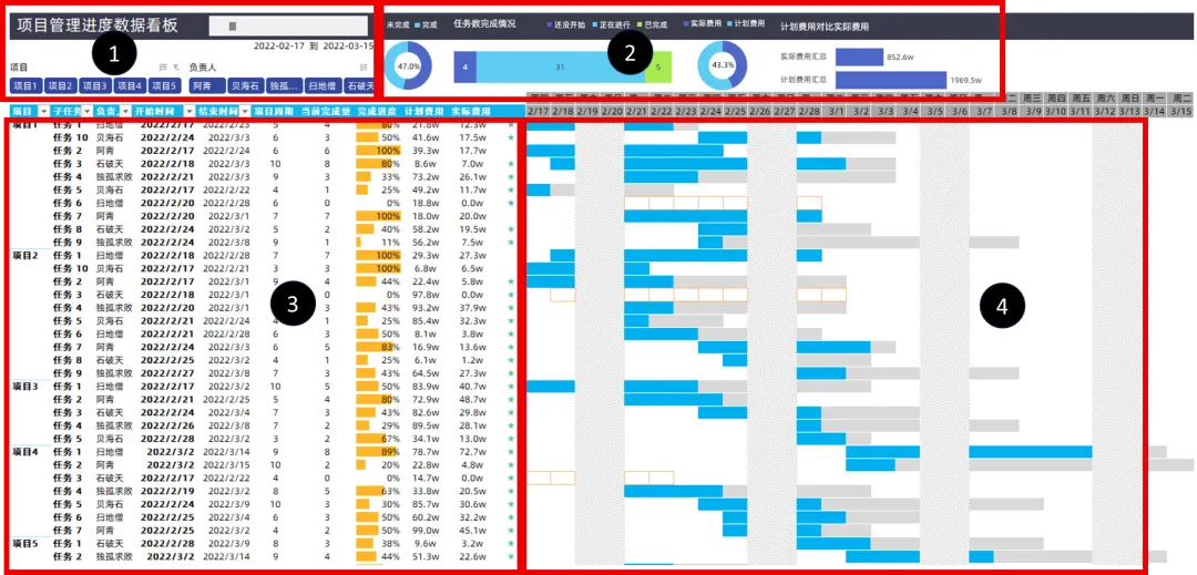 (1)区域为筛选区域,由切片器和滚动条组成,切片器筛选数据,滚动条滚动区域(4)中的甘特条目.