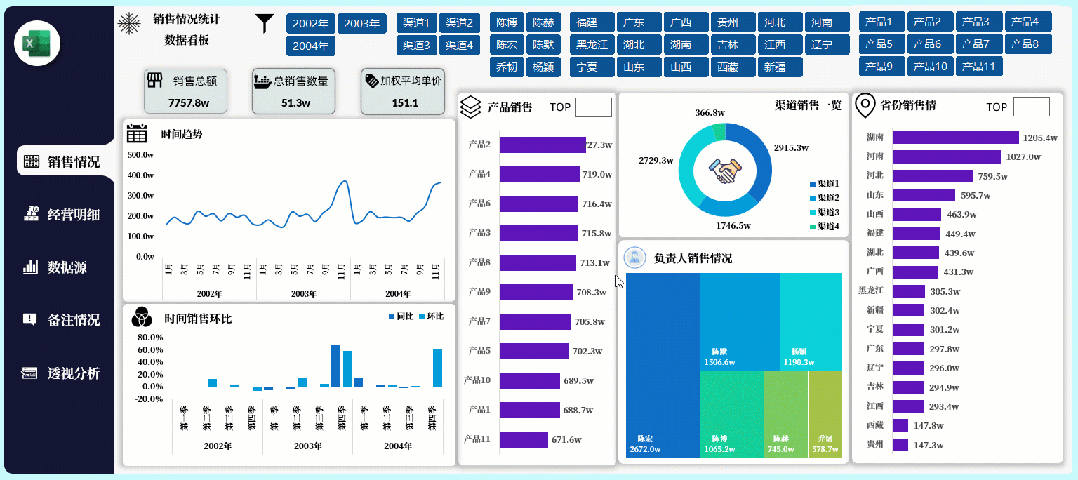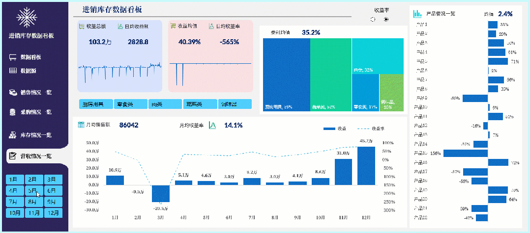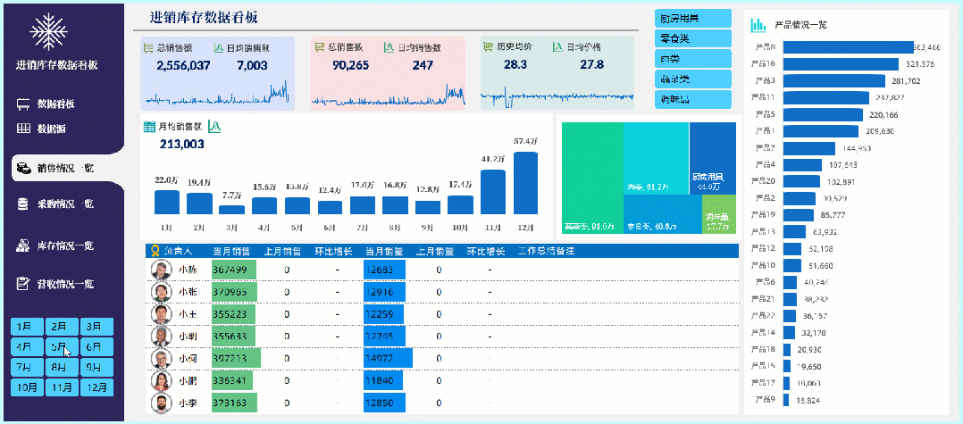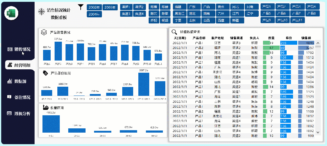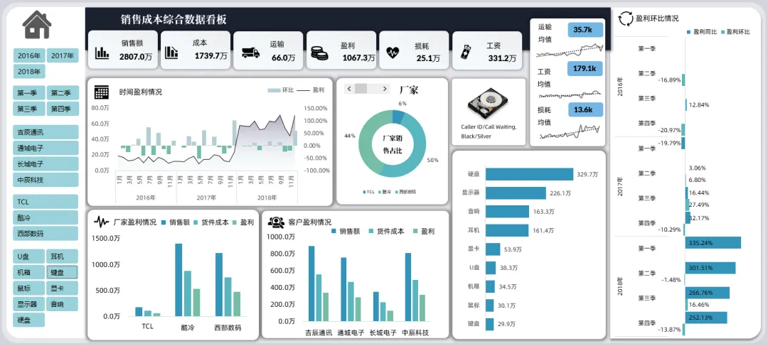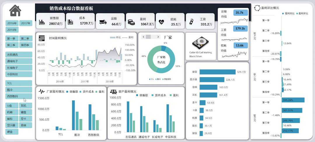 如果你的图表很多,想要反映的类别很多,你可以做出多页类型的看板,每一页都是独立的类别表达,旁边制作的导航器也是相当的精美,当然选择切片器筛选所有内容都会发生对应的筛选变化: