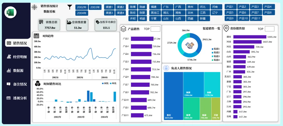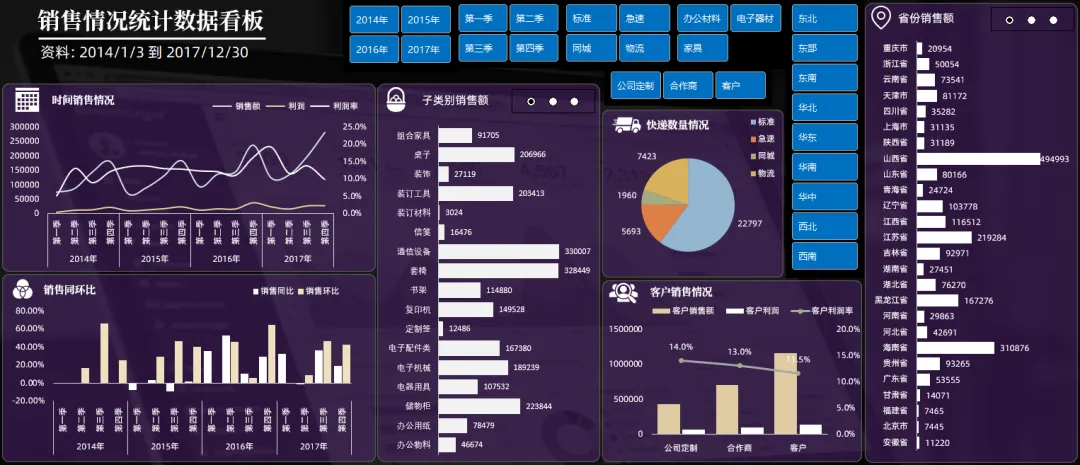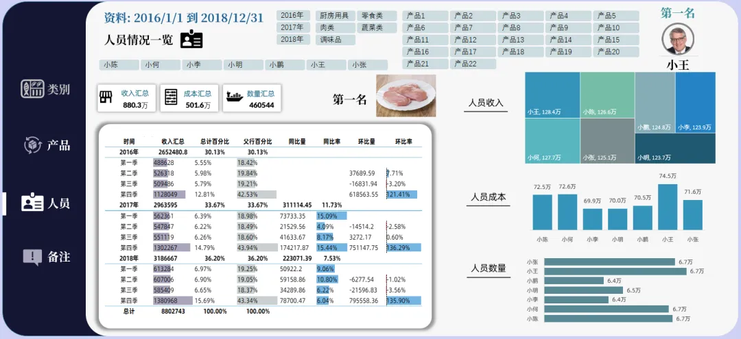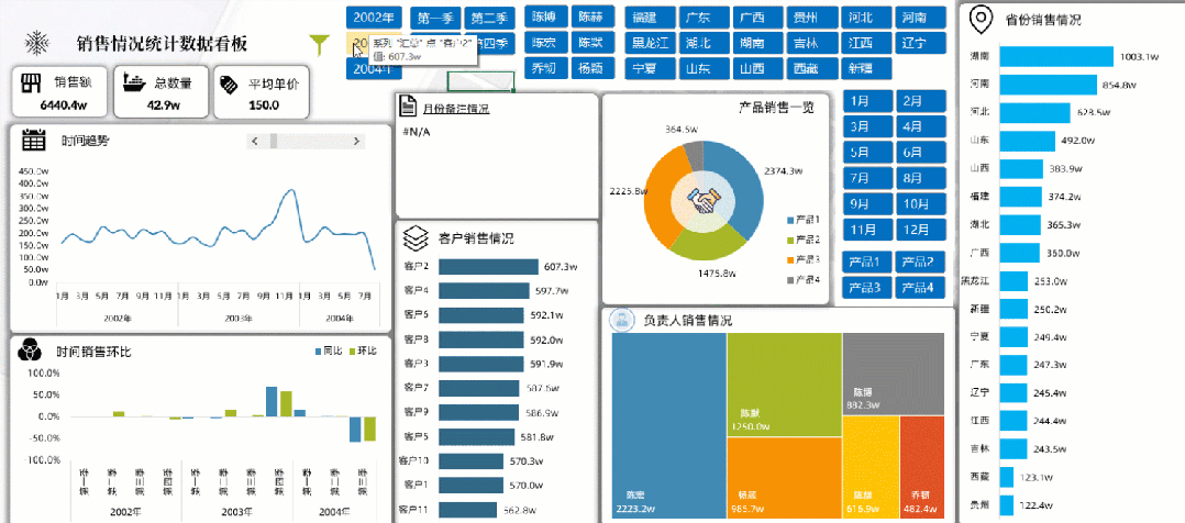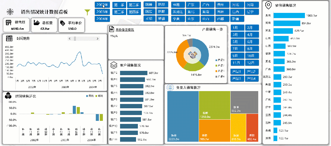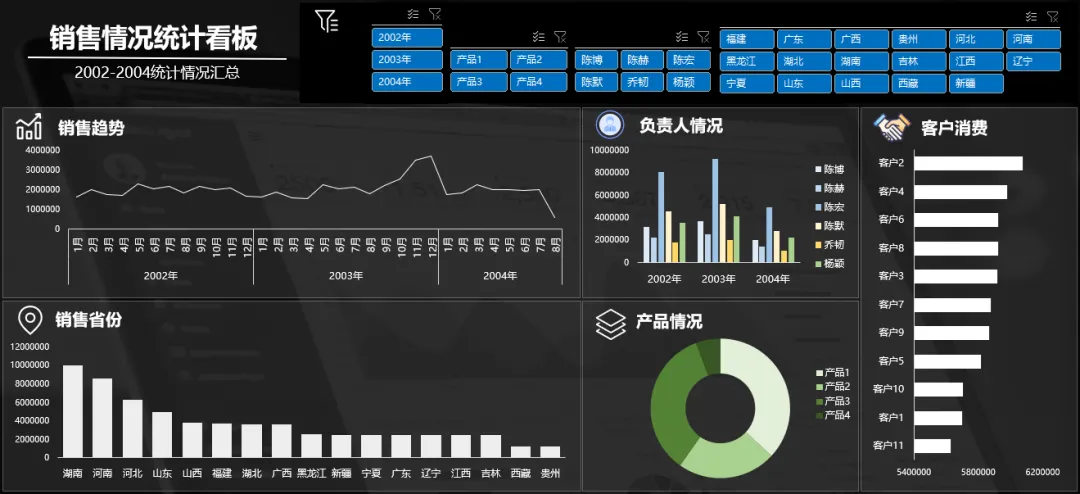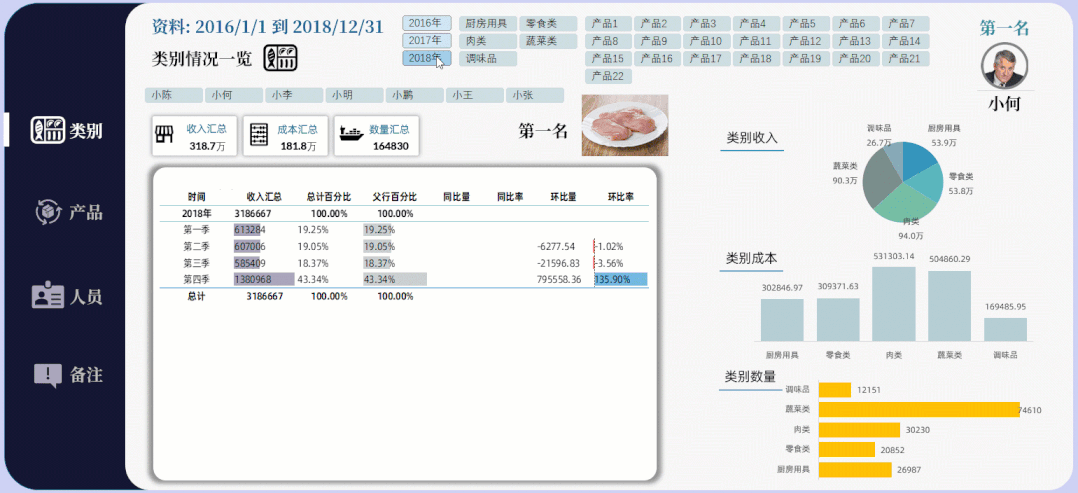 如果你的图表很多,想要反映的类别很多,你可以做出多页类型的看板,每一页都是独立的类别表达,旁边制作的导航器也是相当的精美,当然选择切片器筛选所有内容都会发生对应的筛选变化: