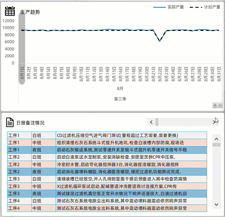 除此以外,做每日倒班期间的生产描述部分,我做了一个滚动的表格类型,当你选择8月份,滚动8月份某一天的生产每个工序的生产生产文字描述情况.