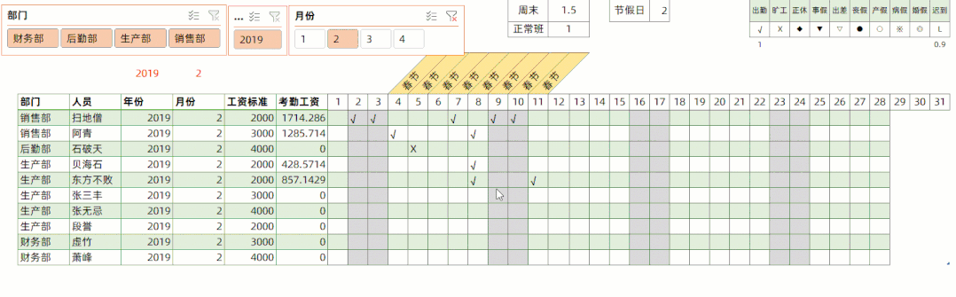 比如在4月份当中写考勤,切换到2月份,如下所示: