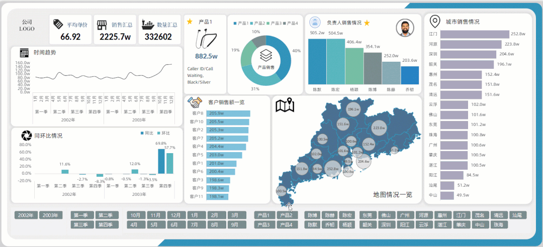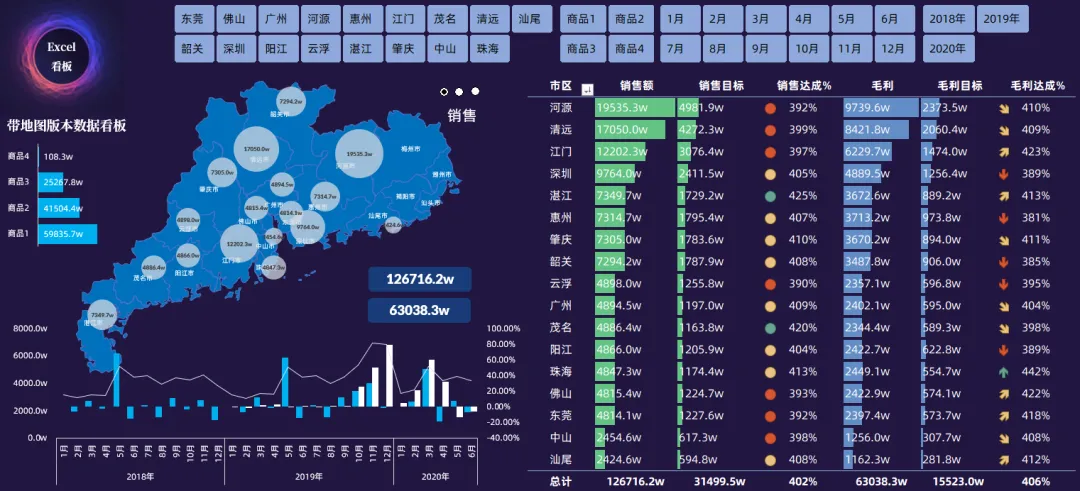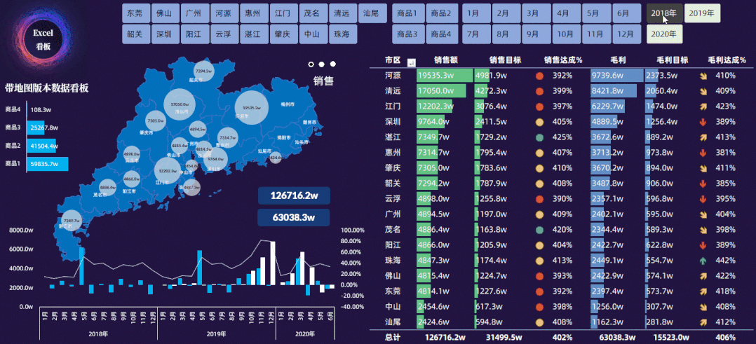 带地图的数据看板,中间的地图不管是WPS还是OFFICE都可以制作和使用,当使用切片器进行筛选,所有的图表或者图片都可以发生相应的筛选变化,但凡是和地址有关系的图表,你都可以使用这种类型: