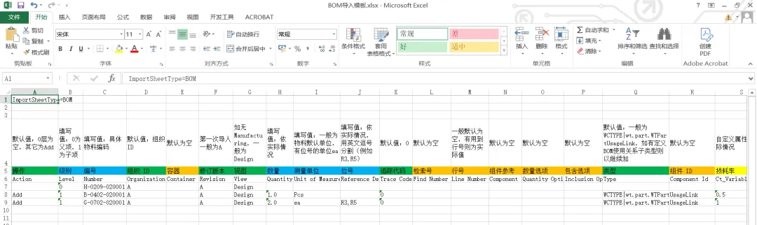 批量导入成功的核心是格式合规。以Windchill标准“BOM导入”Excel模板即可(自定义Excel模板需二次开发功能支持),定位符、列名、格式均为固定配置(字段列左右顺序可灵活调整),私自修改会导致系统无法识别,直接导入失败。
