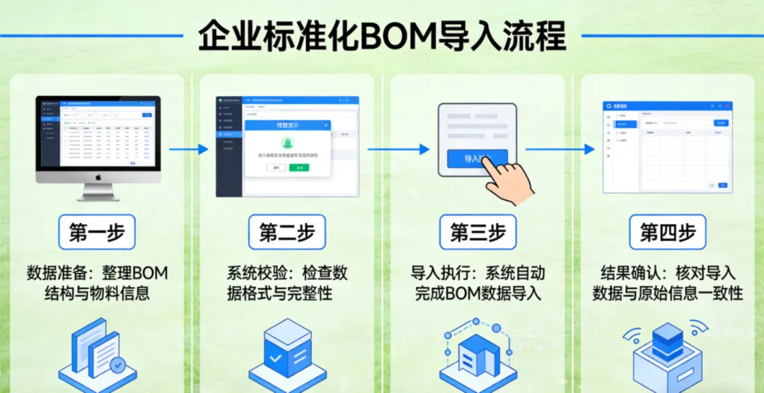 若模板内物料编码不存在、已删除或版本不匹配,系统会直接中断导入。建议先整理物料清单,批量建档核对无误后,再启动导入。