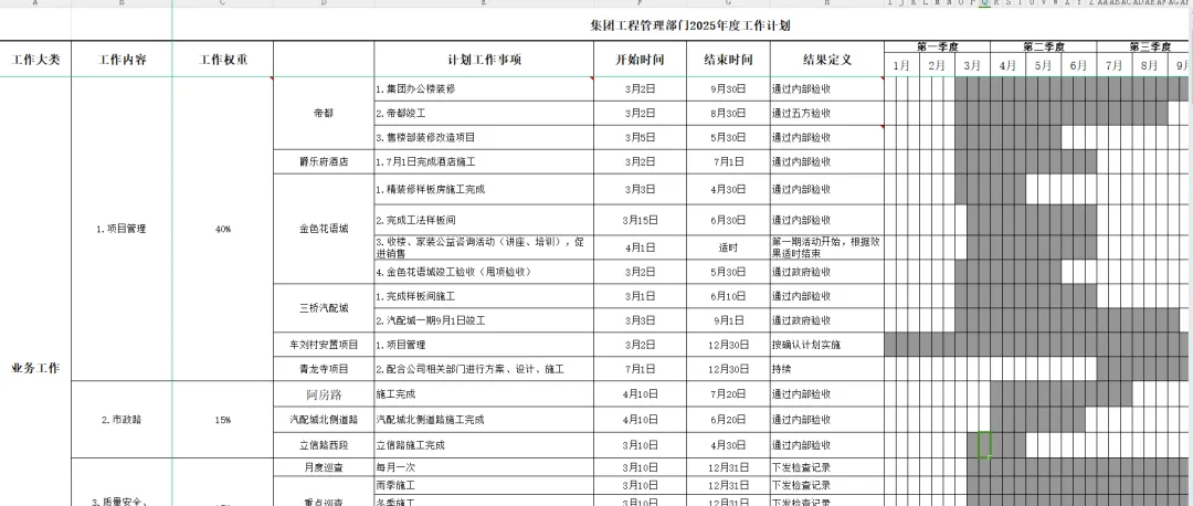1. 督促汇总各项目工程的施工进度,整理各工程的日报及月报,周计划及月计划工作。