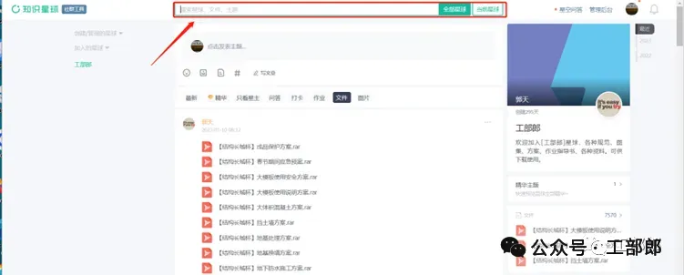 2、进入知识星球主页,页面顶部搜索栏可搜索关键词查找资料