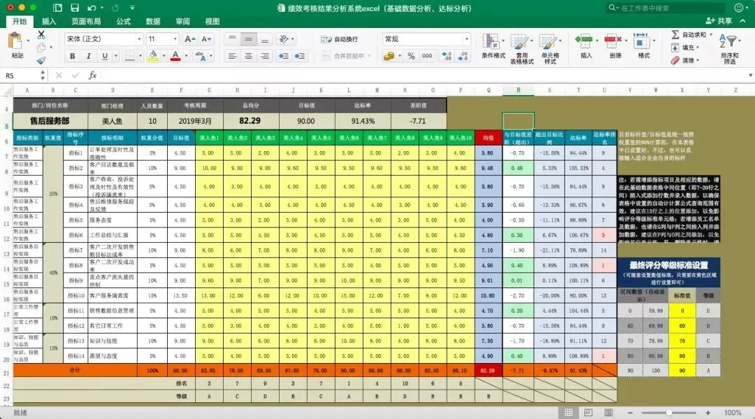 这是绩效考核分析的表的基础数据表,需要手动录入,设置好指标内容及其权重值、评分等级标准,填入目标值以及评分值即可,其它数据为自动生成。