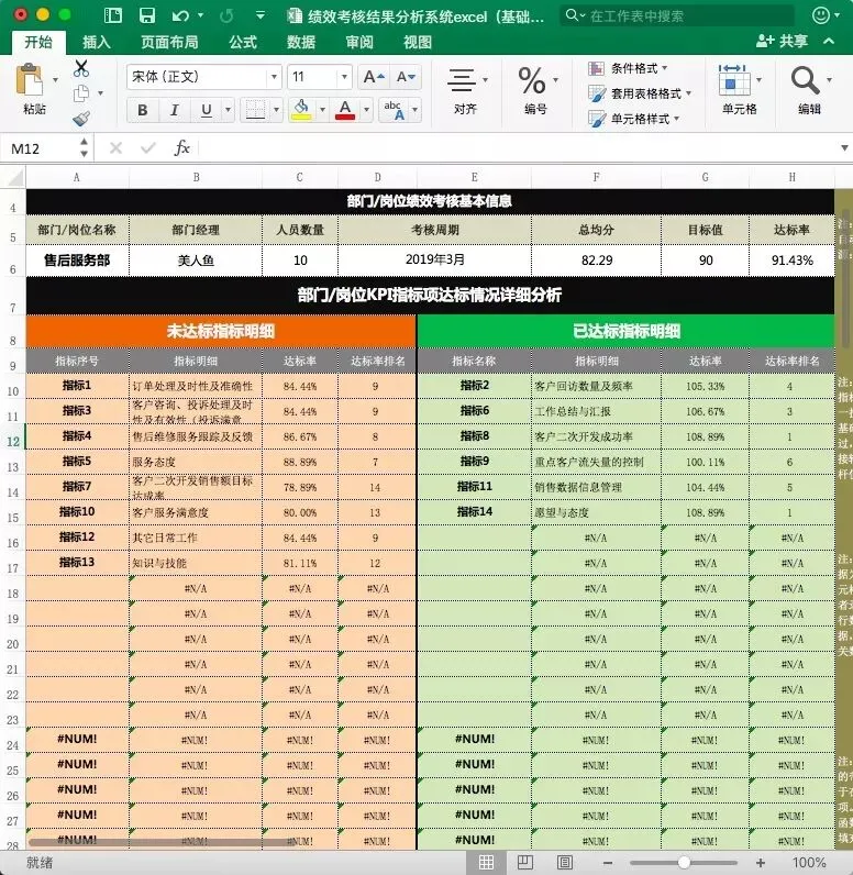 这份Excel模板分四大板块:考核数据表、部门指标达标分析表、员工绩效达标分析表、员工绩效比较分析表。
