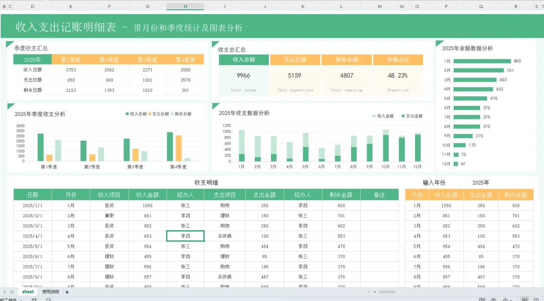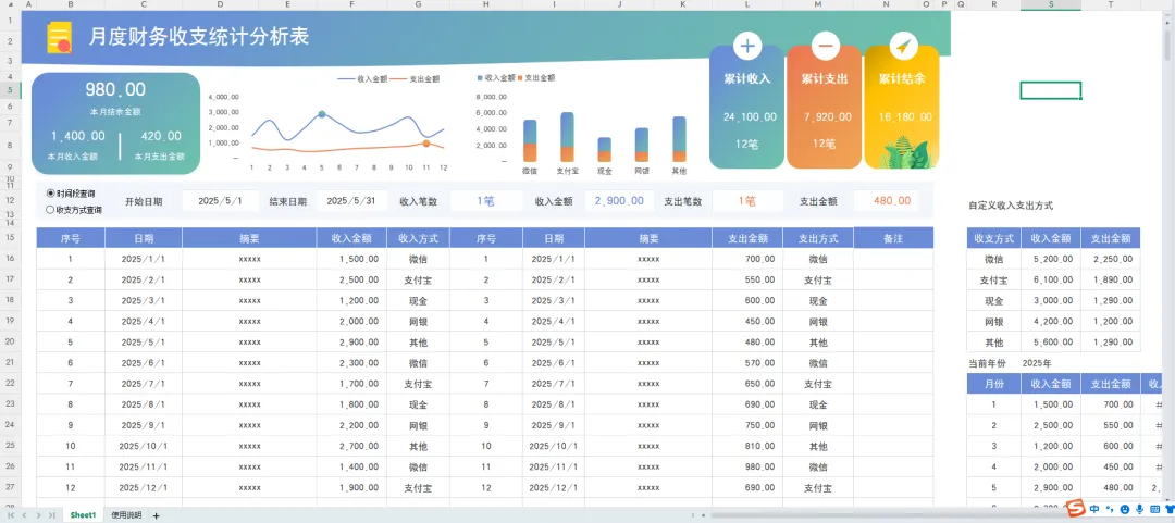 财务收支表模板,带月财务报表分析模板,函数公式已设,财务可编辑修改套用
