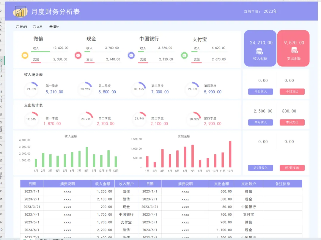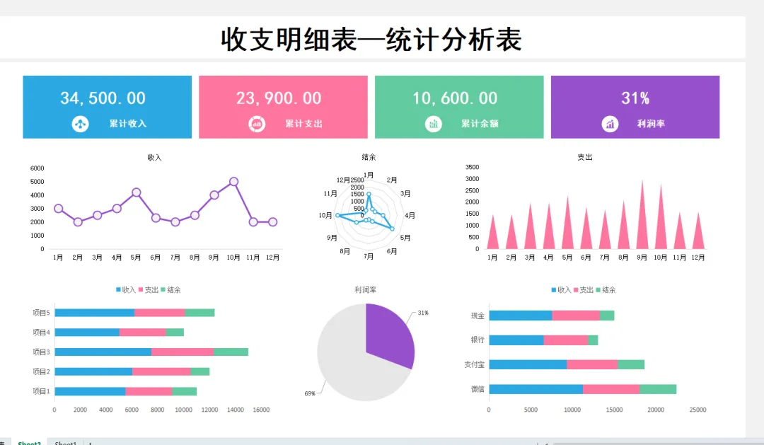 财务收支表模板,带月财务报表分析模板,函数公式已设,财务可编辑修改套用!每月企业财务收支统计分析表不会编制的,财务人员今天可算是找对地方了,今天小帮手带来了现成的全自动Excel财务收支表模板,内设置有自动统计、自动分析的函数公式,财务人员每月做收支明细表时,自己修改基础的财务数据,直接套用就能自动生成可视化财务收支统计分析表了,操作简单,省时省力!下面是常用的财务收支表模板展示,有兴趣的,跟着小帮手一起看看吧。财务收支表模板